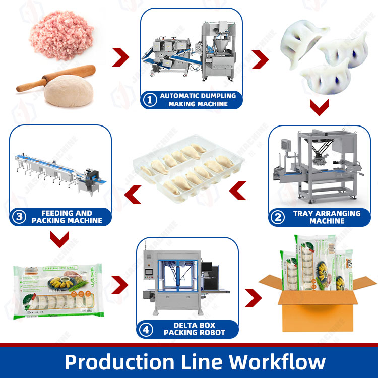 1.Fully automated workflow covering dumpling forming, tray loading, bag filling, cartoning, case sealing, and palletizing.