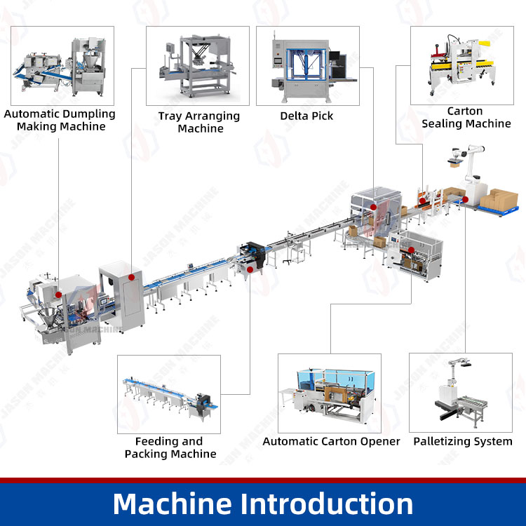 The automatic dumpling production line is designed for efficient manufacturing, tray loading, bag packaging, cartoning, case sealing, and palletizing of frozen dumplings. It integrates automation from product forming to final pallet output, helping factories improve productivity, ensure consistent quality, and reduce manual labor. It is suitable for quick-frozen dumplings(gyoza), wontons, steamed buns, baozi, xiaolongbao, guotie, pierogi and other frozen foods.