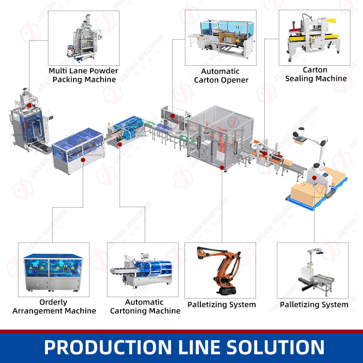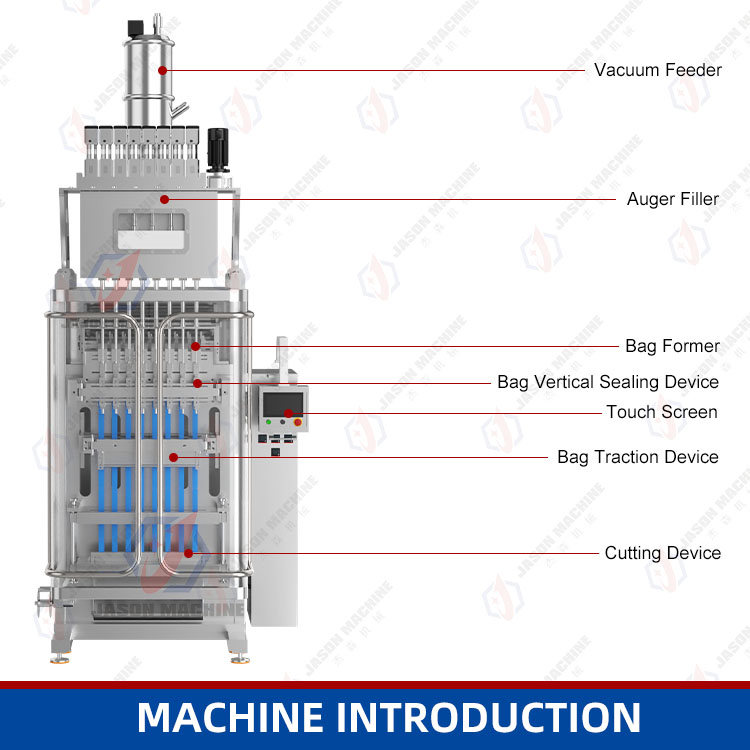 The multi lane powder packing machine is designed for high-efficiency packaging, automatically dosing, forming, filling, and sealing multiple sachets simultaneously. it ensures high speed, accurate filling, and consistent package quality for various powder products in food, pharmaceutical, and chemical industries, such as coffee powder, milk powder, cocoa powder, matcha powder, vitamin powder, probiotic powder, creatine powder, electrolyte powder, collagen powder, hydration powder and others.